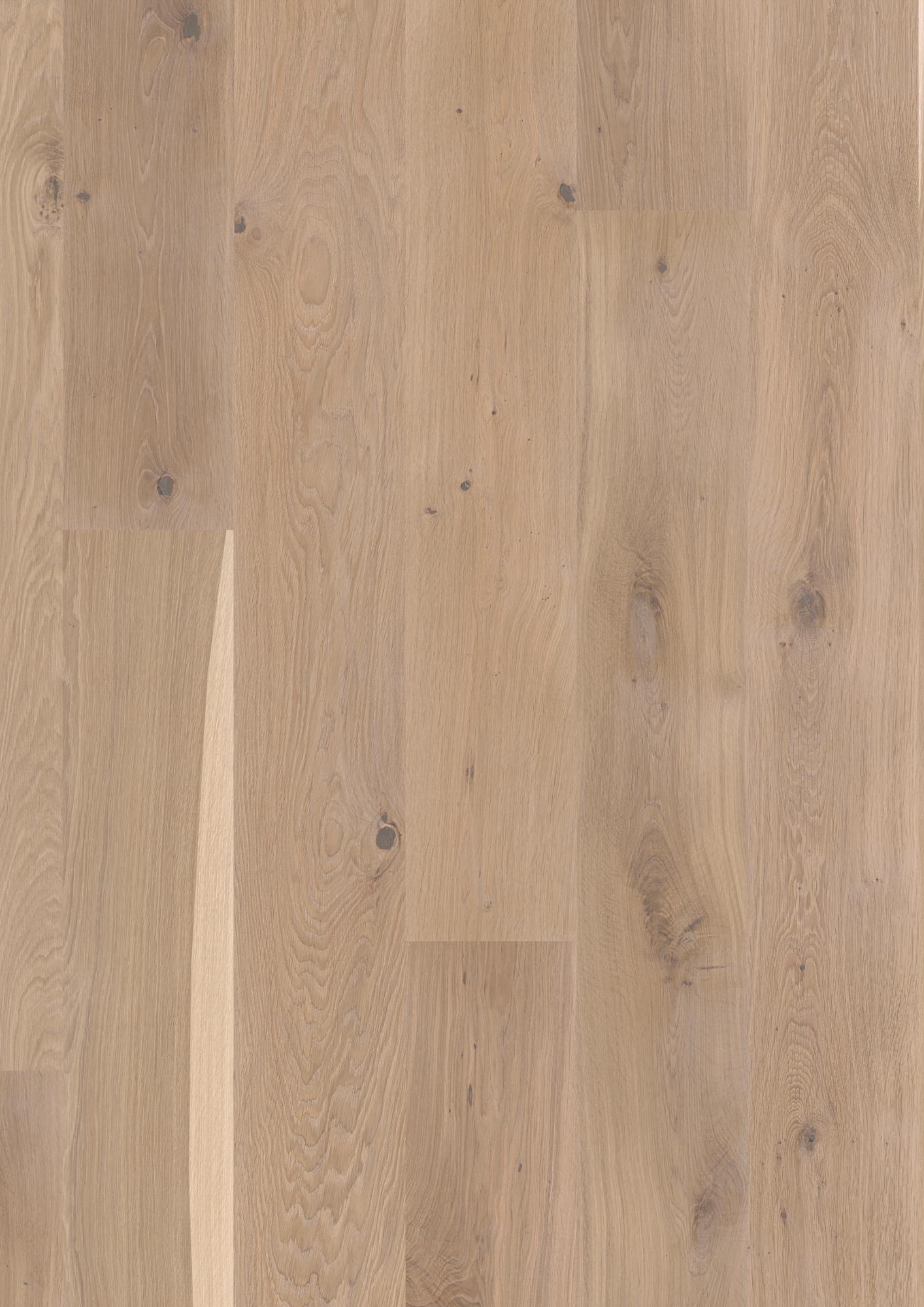 Trægulv i eg med hvid matlak. Rustik sortering. 3,5 mm slidlag.