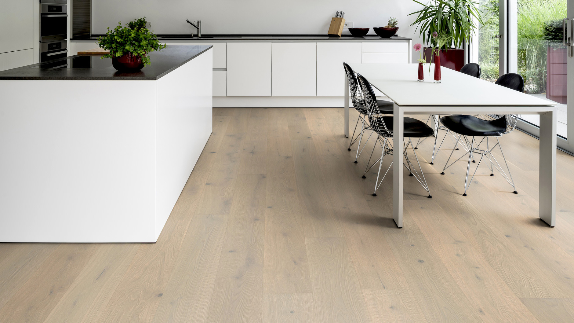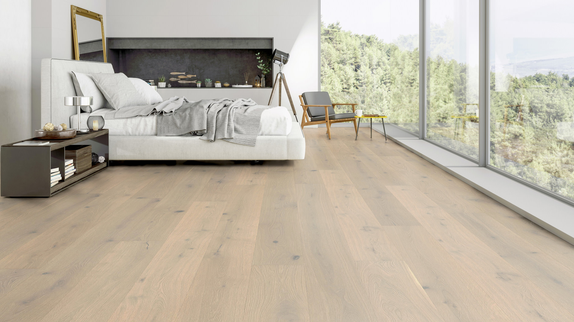 Det ekstra brede plankeformat giver et sammenhængende og eksklusivt gulvforløb med færre visuelle samlinger.