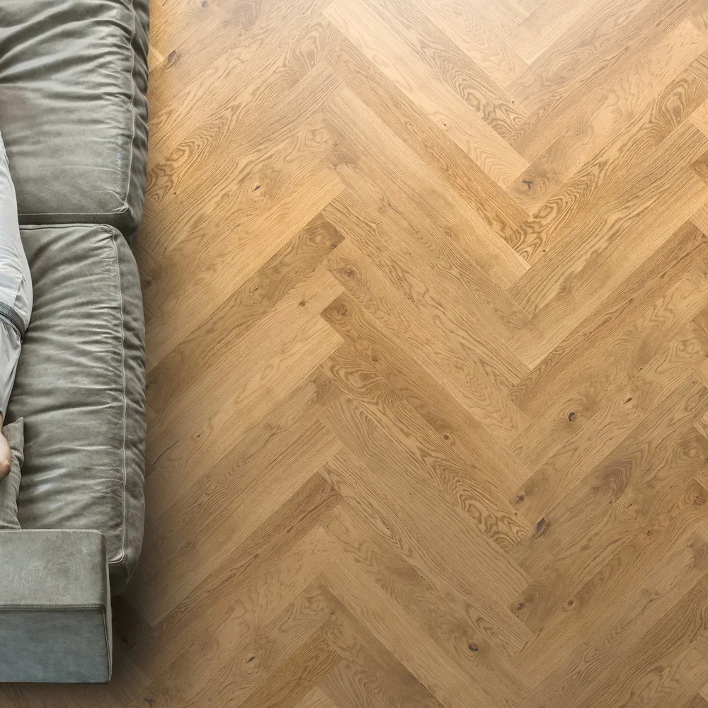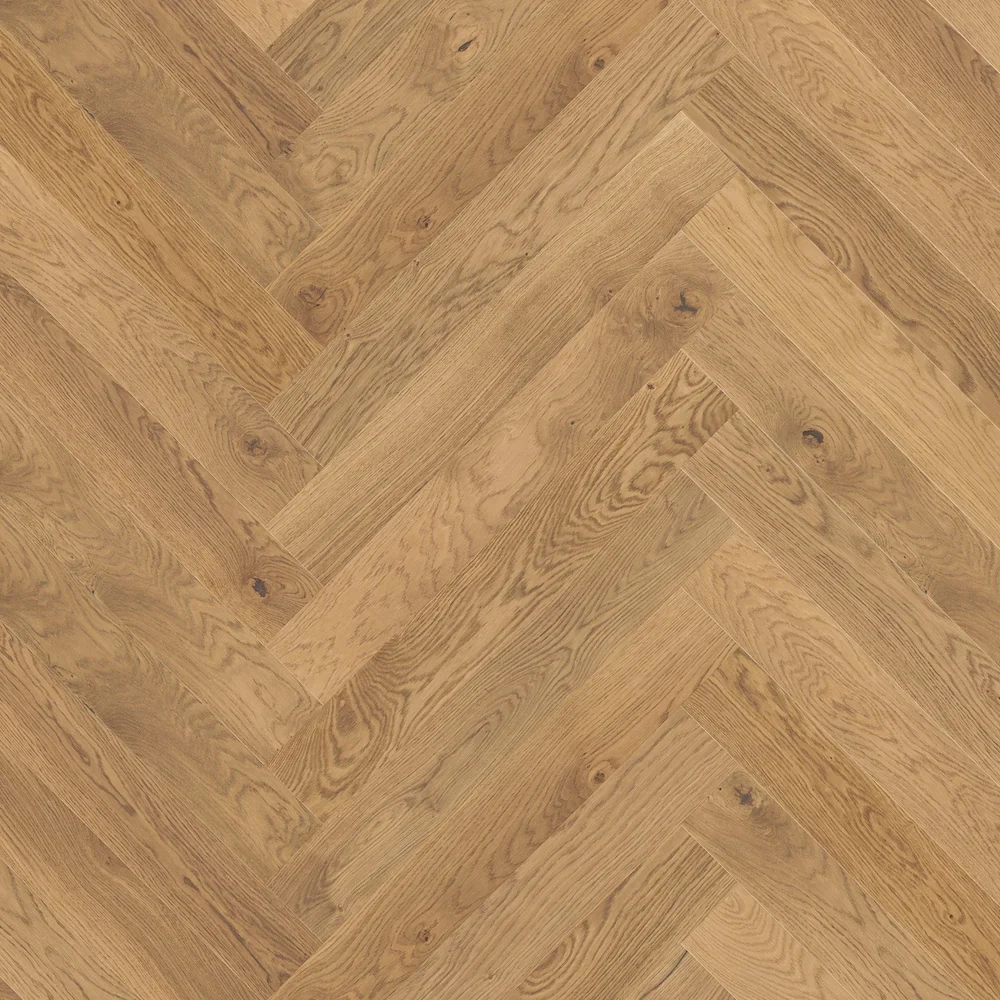 Flot sildeben i lidt større størrelse med synlig 4-sidet fas hvilket fremhæver sildebensmønsteret markant. Hele 3,2 mm slidlag hvilket sikrer et gulv med lang levetid.